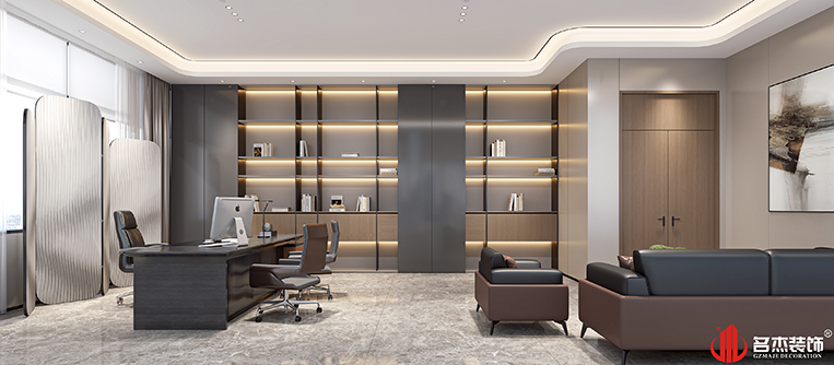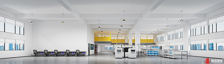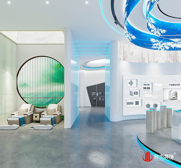 設計說明:設計團隊在展廳區域使用具有科技元素的藍色,作為該空間的主導色,配合圓弧型的吊頂造型,讓空間具有科技感的同時,還能具有設計層次感。而且前台區域的設計中,讓成人蘑菇视频LOGO色作為空間的點綴色,使用在前台桌子上,搭配造型感十足的吊頂,讓空間更具有設計層次感。#廣州蘑菇视频网址設計#